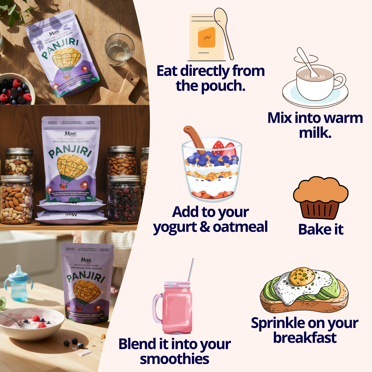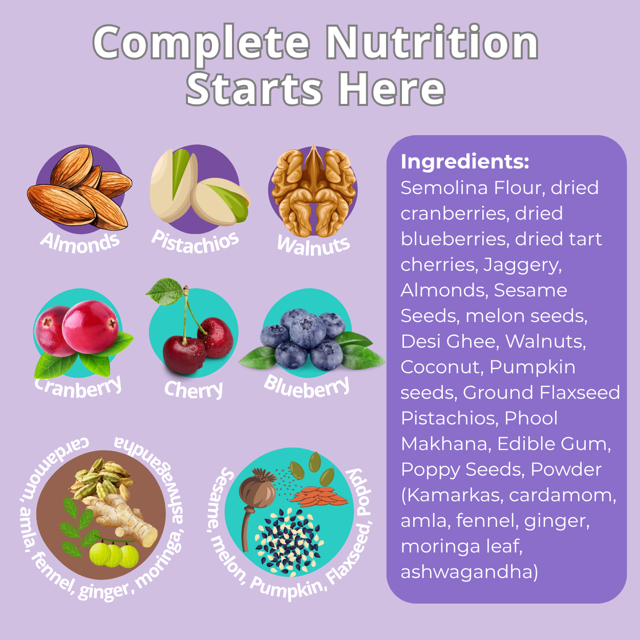 A vibrant, fruity take on the traditional recipe, blending the time-honored goodness of Panjiri with antioxidant-packed berries for a naturally bright, tangy-sweet flavour. Every spoonful delivers wholesome comfort and real benefits: nuts and seeds for steady energy, edible gum for strength and joint support, and ancient herbs for digestion, immunity, and warmth.