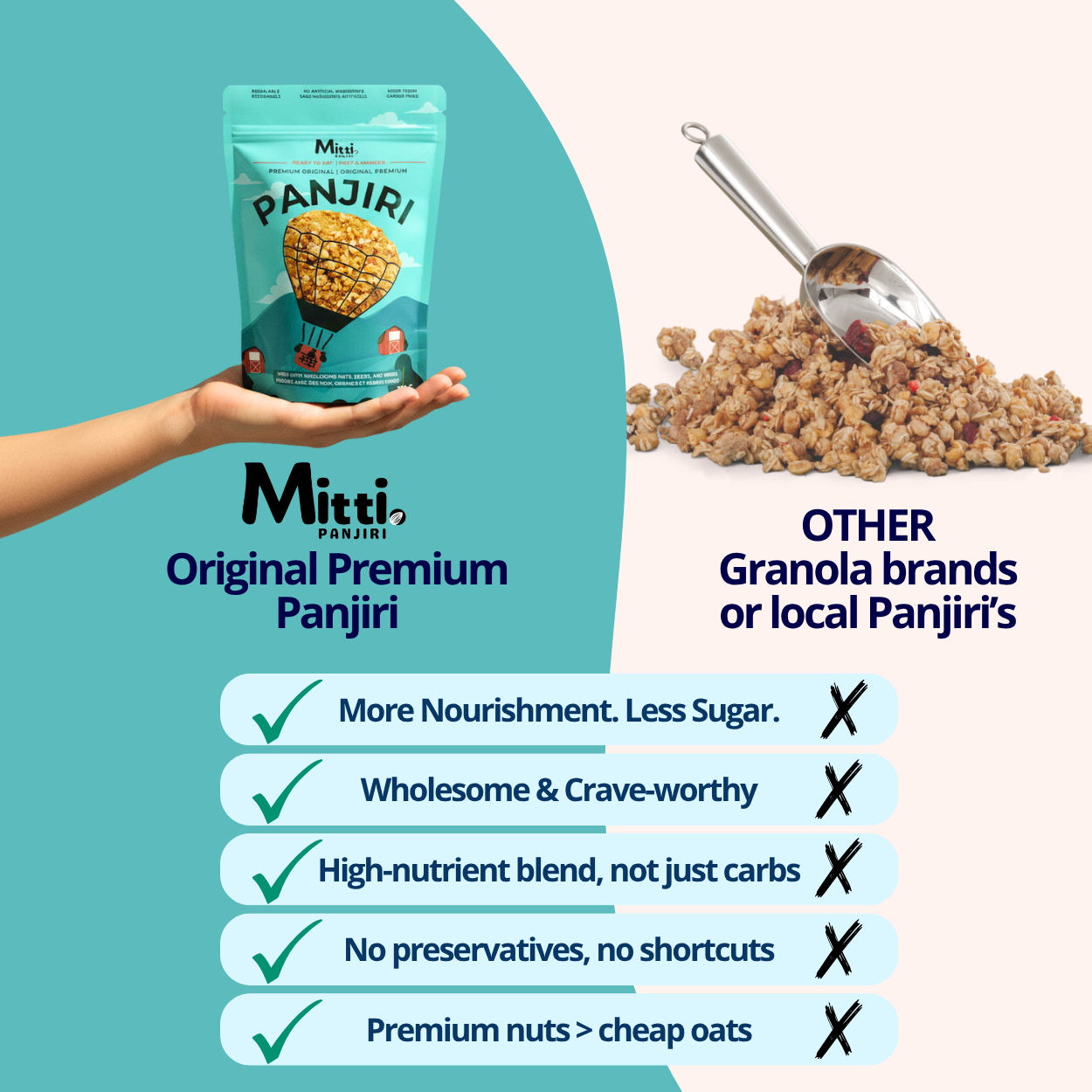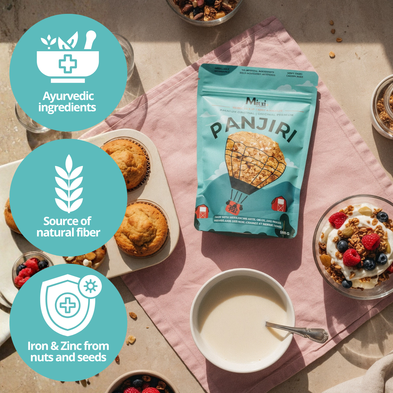 A timeless South Asian recipe, roasted and blended just the way it’s been made for generations. Unlike sugar-loaded granola, every ingredient in Panjiri is chosen for its holistic benefits: almonds for brain health, edible gum for joint support, seeds for sustained energy, and warming spices for digestion.