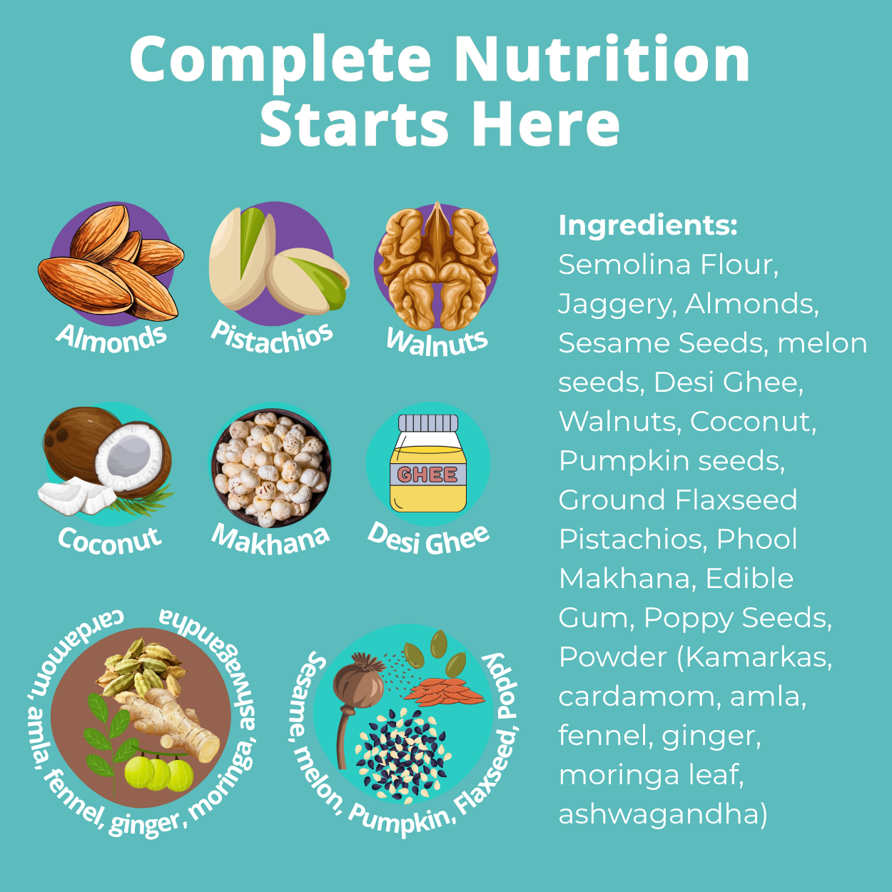 Cardamom, Fennel Seed, Ground Ginger, Organic Amla, Organic Moringa Leaf Powder, Ashwagandha Powder, Kamar Kas